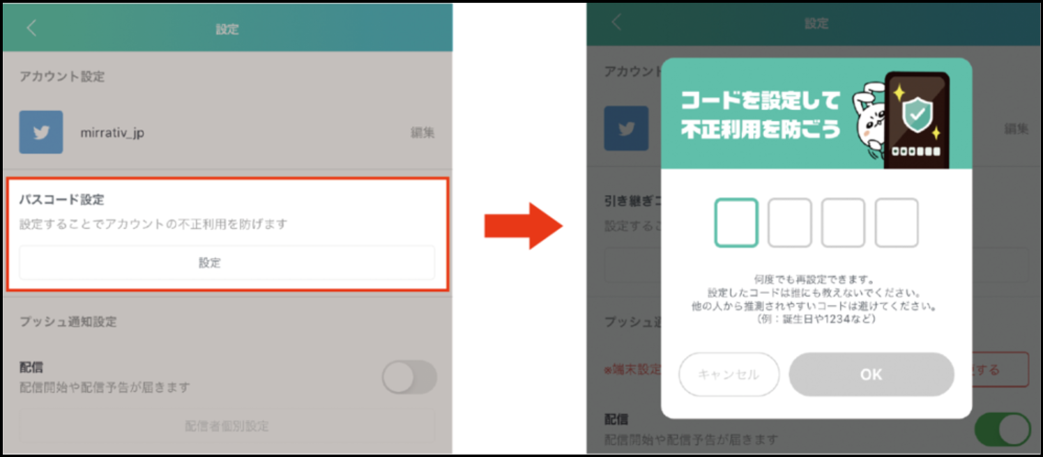 パスコード設定をすると、新規の端末からTwitter連携によるログインを使おうとした場合、