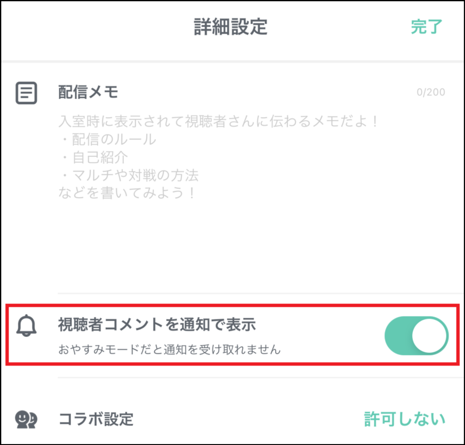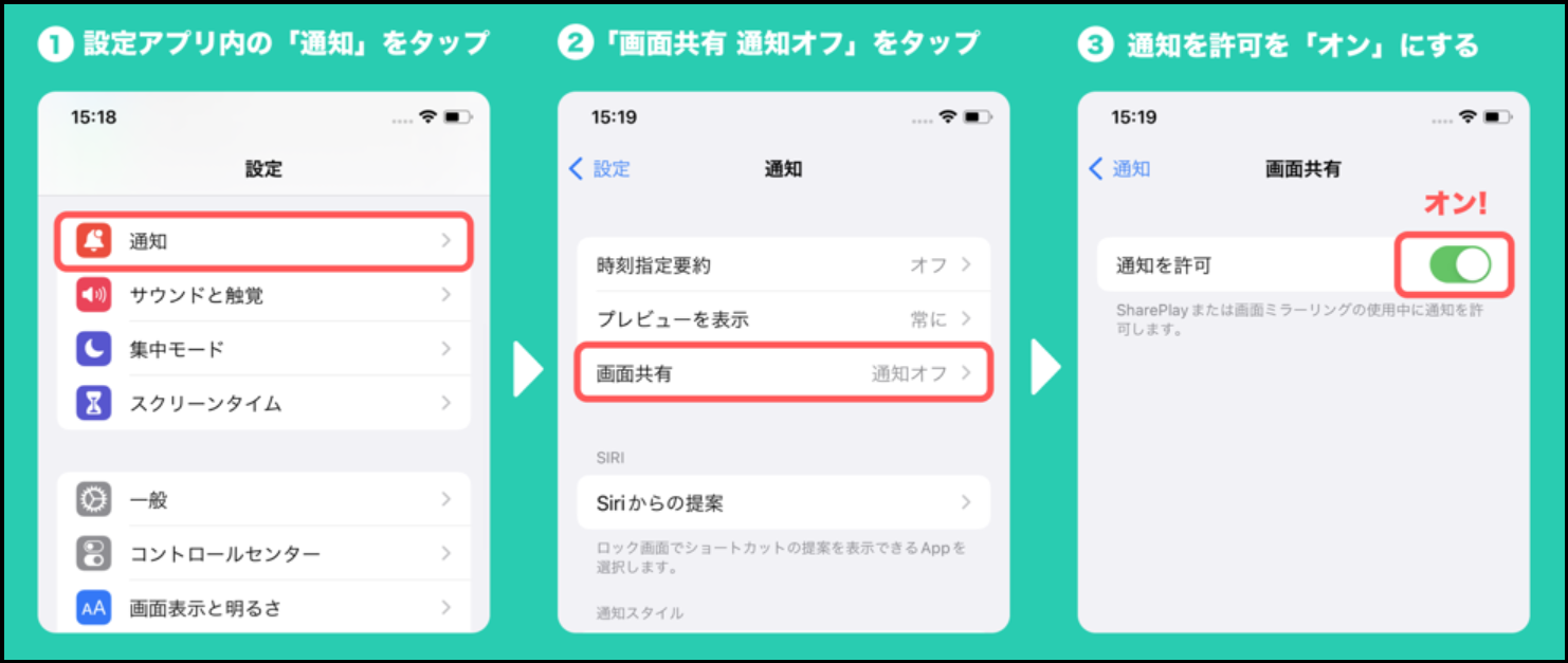 iOS端末でコメントや通知が表示されない 2025年10月23日 13:25 配信のゲーム中にコメントを表示させるために、下記の手順で画面共有の通知をオンにする必要があります。設定アプリ > 通知 > 画面共有をタップ画面共有の「通知を許可」をオンにする また、ミラティブアプリの配信準備画面の右上歯車マーク「詳細設定」から「視聴者コメントを通知で表示」もオンにしてください。 関連記事 ライブゲームに関するお問い合わせについて 配信開始通知とは 配信で音声が聞こえない フォロー・フォロワーについて アプリ設定とは