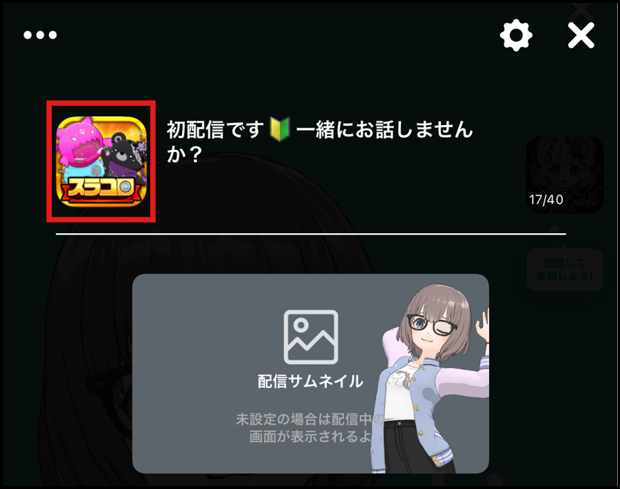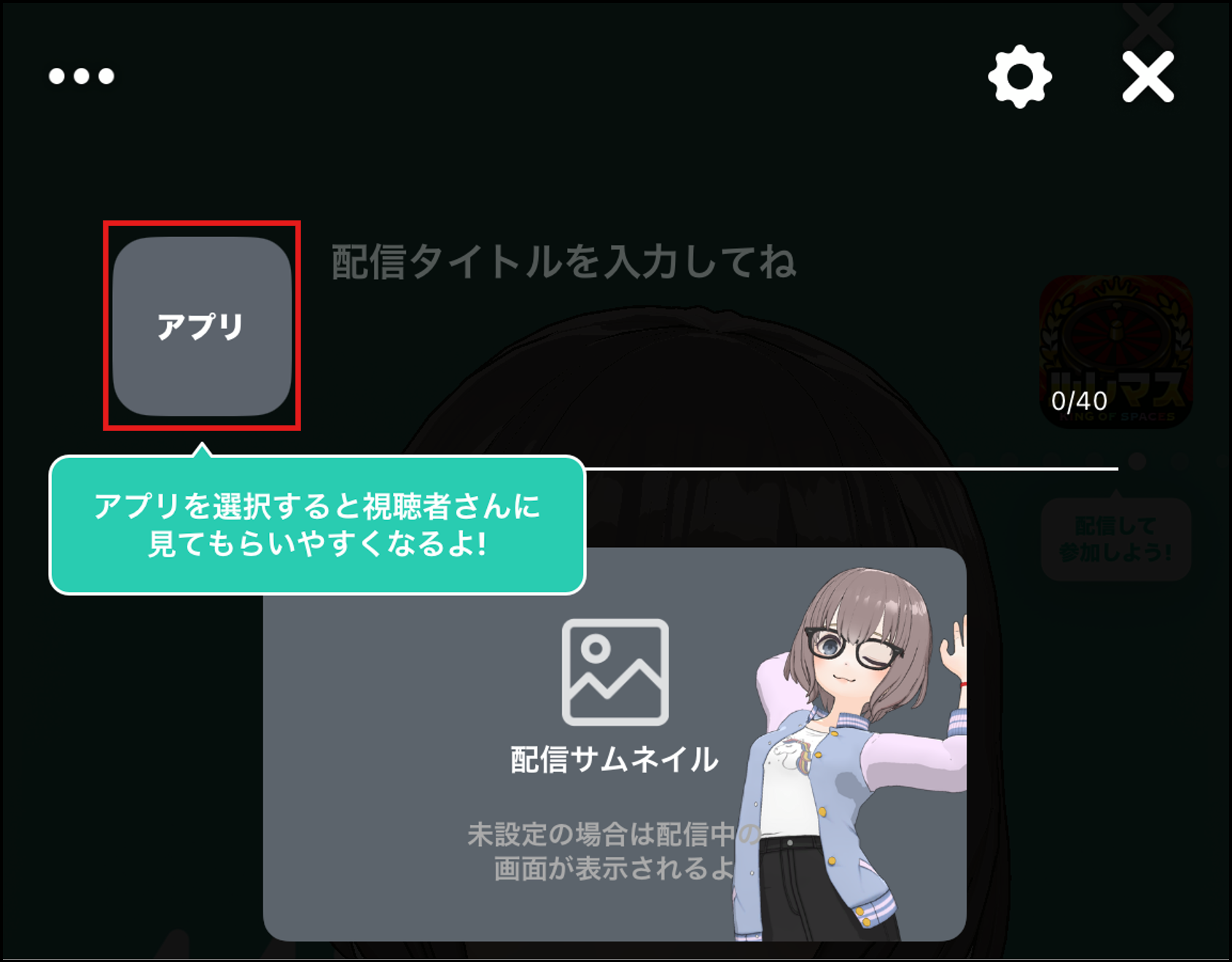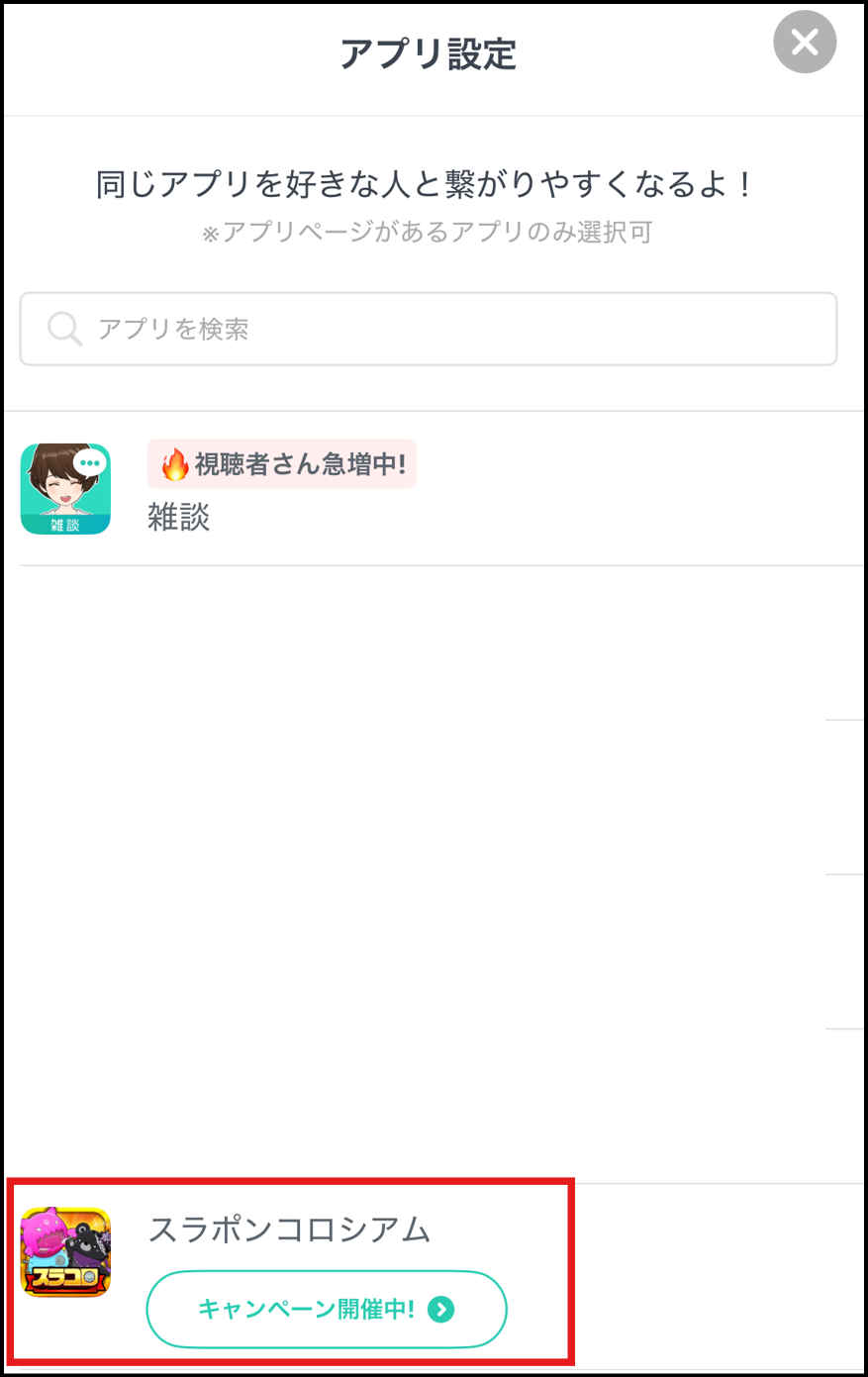 アプリ設定とは 2025年10月24日 00:16 更新 配信するゲームを配信準備画面のアプリ設定で選択しておくと、おすすめ画面の配信中のアプリ一覧にアプリ別に掲載されて、同じゲームを遊んでいる視聴者さんに見つけてもらいやすくなります。 ■配信するゲームの設定方法画面中央下の「配信」をタップ 「配信準備」ボタンをタップ画面上部の正方形のアプリアイコン枠をタップ 設定したいアプリをタップして選択選択したアプリが配信準備画面に表示されれば完了 ※配信中に右上の歯車マークをタップすると、配信中にアプリ設定を切り替えることもできます。 関連記事 配信の始め方 PC配信について コメント機能について iOSにおける読み上げ機能について 画面共有の停止機能とは