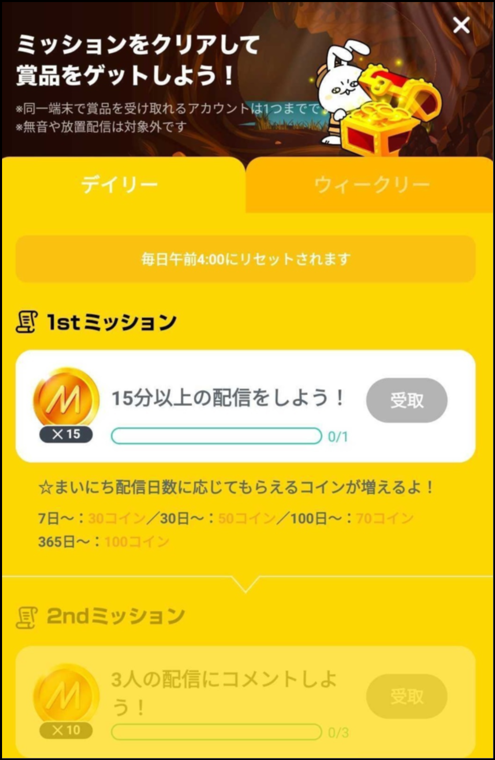 1stミッションは無音配信や放置配信、Androidの画面分割をしている場合、ミッションクリアとはなりませんのでご注意ください。